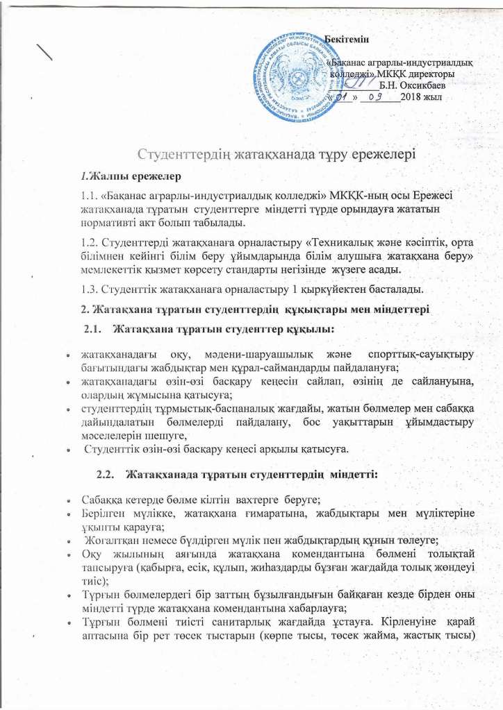 | Бақанас аграрлы-индустриалдық колледжінің жатақханасының жобалық қуаттылығы 360 орынға арналған. Жатақханадан орын қажет еткен студенттер жатақхана орнымен толық тегін қамтамасыз етіліп, жағдай жасалған. 4 қабатты колледж жатақханасының 1-2 қабаты іске қосылған, ондағы жатын орны 160 жатын орынға арналған. Жатақхананың бір секциясында 2 және 3 орынға арналған бөлме бар. Барлық бөлмелер төсек орынмен және жабдықтармен, жиһаздармен толық қамтылған. |