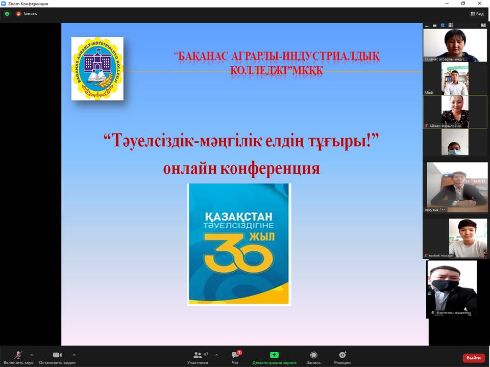 2021 жылы 3 маусым күні Бақанас аграрлы-индустриалдық колледжінің Студенттік парламент және Жастар ісі жөніндегі комитетінің ұйымдастыруымен Қазақстан Республикасы Тәуелсіздігіне 30 жыл толуына орай «Тәуелсіздікке тағзым» атты іс-шаралар жоспары аясында “Тәуелсіздік-мәңгілік елдің тұғыры!” атты онлайн конференция өтті. Конференцияның мақсаты: студенттерді Тәуелсіздік жылдарында өз елінің жетістіктері үшін мақтаныш сезімін дамыта отырып, патриоттыққа тәрбиелеу. Конференцияға Балқаш ауданының жастар ресурстық ортылығының маманы Гүлшат Берікбайқызы мен Балқаш аудандық мәслихатының депутаты Нұрман Мақсат Маратұлы қатысты. Студенттер Тәуелсіз Қазақстан Республикасының тәуелсіздік тарихы мен тәуелсіздік жылдарындағы қол жеткен жетістіктері туралы баяндама жасап, презентация көрсетті.
