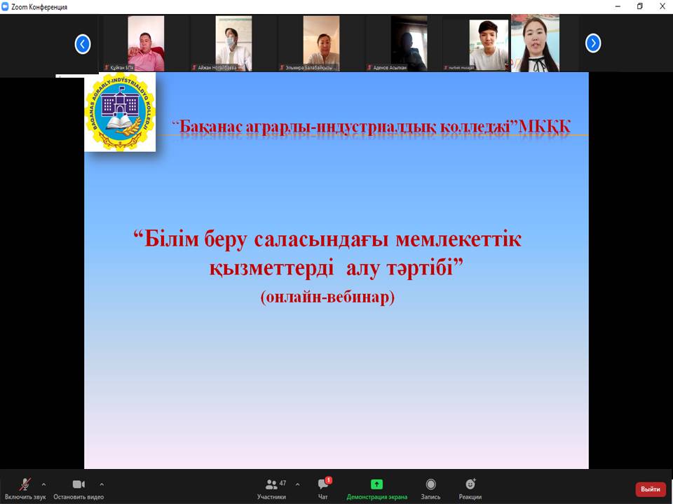 2021 жылы 3 тамыз күні Бақанас аграрлы-индустриалдық колледжінде білім беру саласындағы мемлекеттік қызметтерді алу тәртібін түсіндіру мақсатында ата-аналар мен студенттердің қатысуымен “Білім беру саласындағы мемлекеттік қызметтерді алу тәртібі” тақырыбында онлайн-вебинар өтті.
