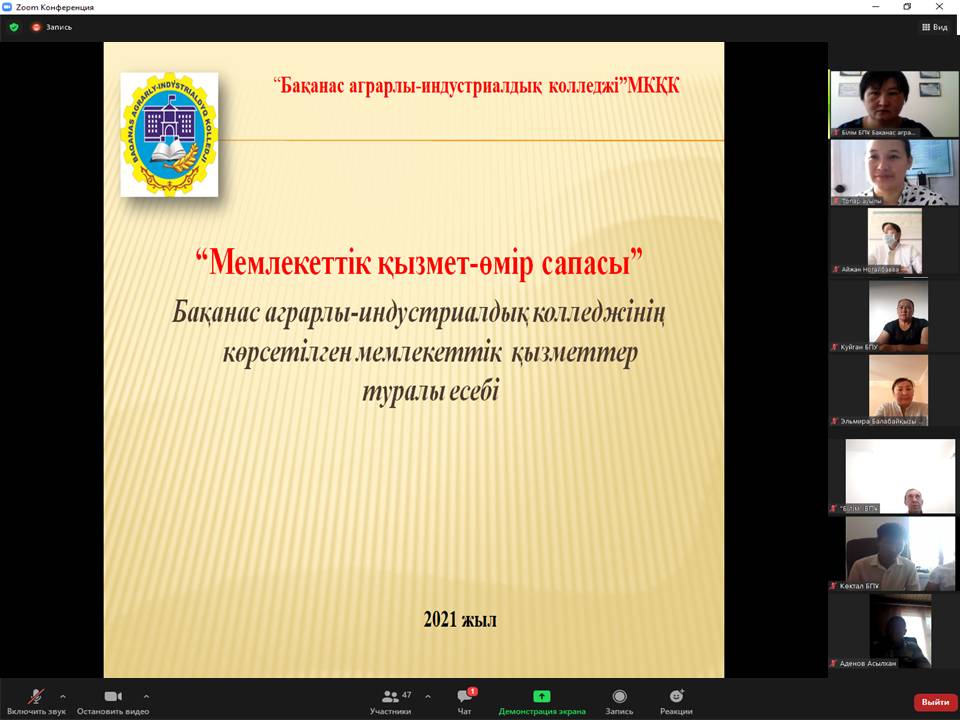 02.08.2021 жылы Бақанас аграрлы-индустриалдық колледжінде Мемлекеттік көрсетілетін қызметтер бойынша жұмыс туралы Қазақстан Республикасының «Мемлекеттік көрсетілетін қызметтер туралы» Заңының 23 бабы 6 тармағына сәйкес, «Мемлекеттік қызмет-өмір сапасы» тақырыбында Бақанас аграрлы-индустриалдық колледжінің мемлекеттік көрсетілетін қызметтер есебі туралы қызмет алушылардың қатысуымен онлайн форматта ZOOM бағдарламасы арқылы талқылаулар өткізіліп, түсіндіру жұмыстары жүргізілді.
